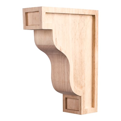 Box of Two - Waved Arts & Crafts Corbels 2" wide x 6" deep x 8" tall - Rubberwood. What is Rubberwood? Rubberwood is a hardwood from the maple family of woods Rubberwood has very little tendancy to warp or crack Rubberwood-Eco Friendly ! Rubberwood is often the most misunderstood species of wood in the furniture industry. The name rubberwood invokes a variety of misconceptions as to it's features and to it's durability. Rubberwood (also called Parawood in Thailand) is the standard common name for the timber of Hevea brasiliensis. In fact, rubberwood is one of the more durable lumbers used in the manufacturing of today's home furnishings. As a member of the maple family, rubberwood has a dense grain character that is easily controlled in the kiln drying process. Rubberwood has very little shrinkage making it one of the more stable construction materials availabe for furniture manufacturing. Like maple, rubberwood is a sap producing species. In the case of maple, it is sap; in the case of rubberwood, it is latex. Rubberwood produces all the latex used in the world for all rubber based products. There is one more important feature of rubberwood that is very important in today's world. Rubberwood is the most ecologically "friendly" lumber used in today's furniture industry. After the economic life of the rubber tree, which is generally 26-30 years, the latex yields become extremely low and the planters then fell the rubber trees and plant new ones. So, unlike other woods that are cut down for the sole purpose of producing furniture, rubberwood is used only after it completes it's latex producing cycle and dies. This wood is therefore eco-friendly in the sense that we are now using what was going as waste. Do not mistake the name rubberwood when it comes to its quality features.